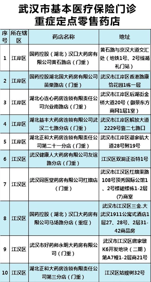 当前,武汉市医保门诊重症(慢性)疾病定点零售药店已达到50家,中心城区每个区不少于4家,新城区每个区不少于2家,且全部提供高血压、糖尿病、血管介入术、乙肝、丙肝、肝硬化、恶性肿瘤、慢阻肺、肾移植术后、帕金森10个病种的购药服务。