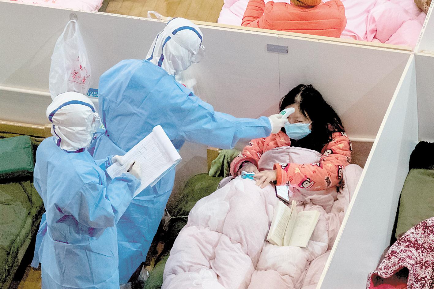 2月18日晚,武汉体育中心方舱医院,江苏医疗队的护士在病床旁忙碌。 (湖北日报全媒记者 柯皓 摄)