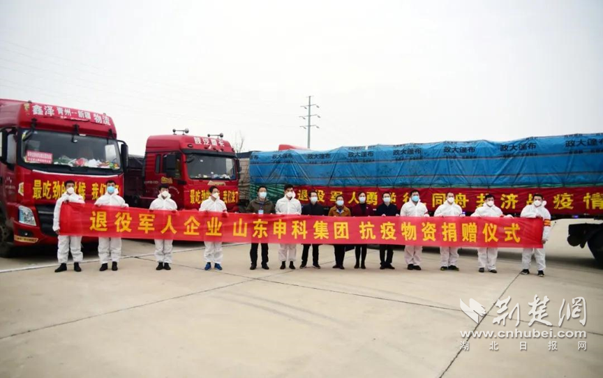 荆楚网客户端—荆楚网消息(通讯员 包晓霁)2月27日上午,经过17个小时的长途跋涉,10辆满载爱心物资的运输车抵达湖北。这是由山东省退役军人王兆才创办的山东济宁申科汽车销售服务集团有限公司向湖北捐赠的物资,将分别向武汉捐赠50000多片医用纸尿裤、向黄冈捐赠7680袋大米和12000箱桶装泡面,总价值200万元。