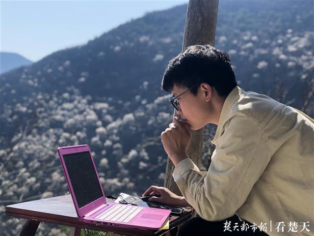 海拔2780米深山的一处平地,年轻的黄老师趴在简陋的小木桌上,用手机当wifi热点,凑近笔记本电脑屏幕,与远在武汉的学生互动,完成了新学期的第一堂网课。