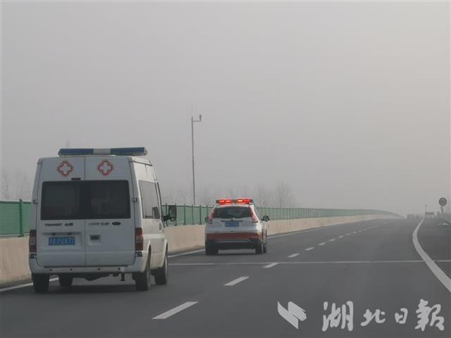 7:40分,短暂休整后,任务车辆由湖北高速路政护航,一路疾驰武汉。
