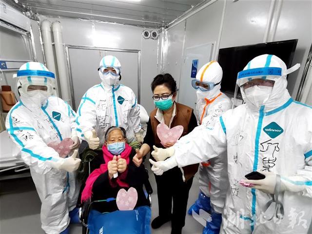 经过多日对症及支持治疗,胡婆婆病情逐渐好转,和女儿丁女士一起于3月1日康复出院。武汉大学中南医院院长、雷神山医院院长王行环教授发给两人出院证明,并赠送鲜花及纪念品。“你们像亲人一样照顾我们,在我们失去信心时鼓励我们!”离开医院时,母女俩含泪连声向医护人员致谢,