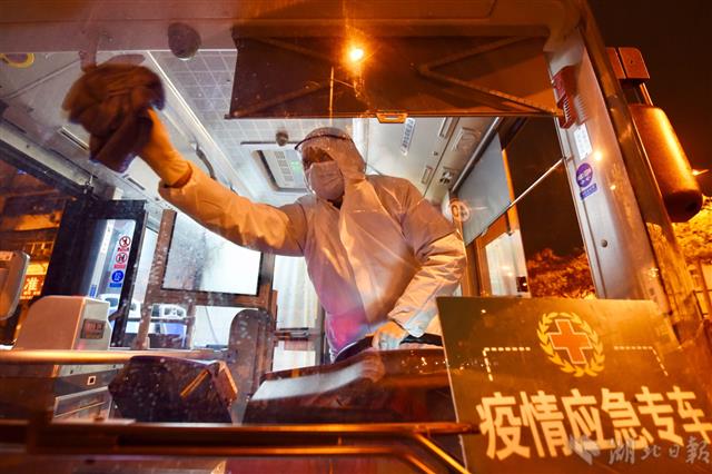2月24日凌晨1时07分,武汉市青山区沿港路,结束了当天患者转运任务的武汉公交六公司党员驾驶员郑少银一边擦前挡玻璃一边等待专业人员来给车辆消毒。