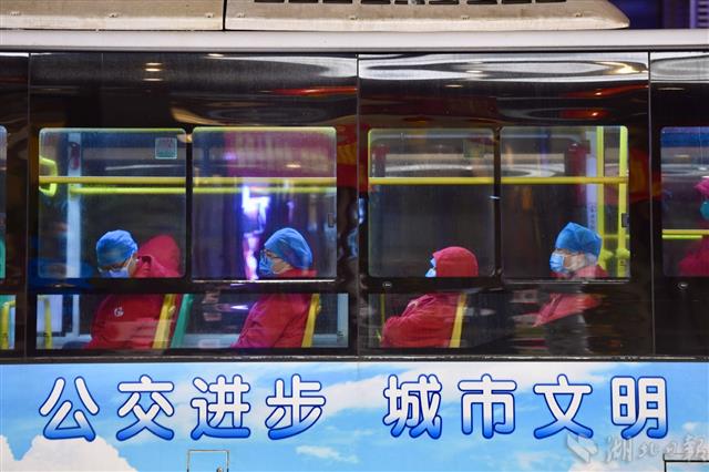 2月28日凌晨1时30分,武汉市洪山区未来城大酒店,即将从酒店驻地出发前往麒麟物流方舱医院的内蒙古医疗队医务人员登上公交车。