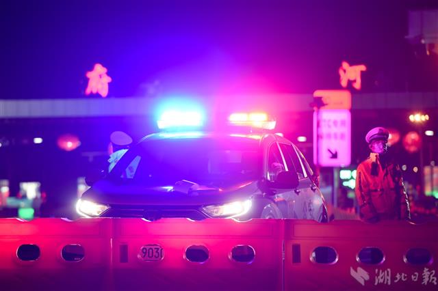 2月24日凌晨2时59分,武汉市黄陂区岱黄高速府河收费站,执勤交警严守武汉“北大门”。