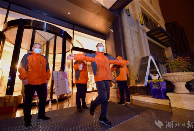 2月24日凌晨2时20分,武汉市江岸区华岭路亚朵酒店,陕西省第二批援鄂医疗队队员、西安国际医学中心医院的医务人员结束了当班工作任务,回到驻地酒店前进行消毒处理。