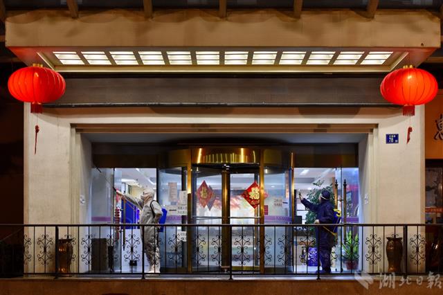 2月24日晚11时02分,武汉市武昌区珞珈山街瑞安城市酒店,两名值班人员为酒店大堂进行当天第三次消杀,该酒店于2月初被征用为“密切接触者”集中隔离点。