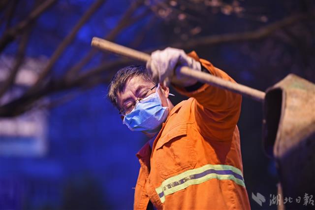 2月25日清晨6时03分,武汉市武昌区秦园路,53岁的环卫工杨新友清理马路中央的废弃物。