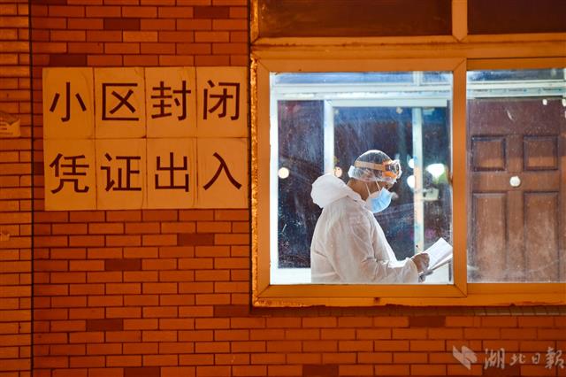 2月24日凌晨0时18分,武汉市青山区冶金街楠姆社区工业四路随州街执勤点,值班员张小安(图左)、蒋爱军(图右)仔细检查出入小区居民的证明文件,并进行测温和登记。