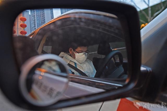 2月25日清晨6时58分,武汉市江汉区姑嫂树路兴业路口,26岁的滴滴出行驾驶员成卓正在车上等待预约用车的医护人员。