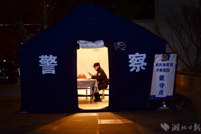 2月24日凌晨4时25分,武汉市硚口区武汉体育馆方舱医院值守点,宝丰街派出所民警杨威驻守在此,方舱内200余名患者和医务人员让他不敢有丝毫懈怠。