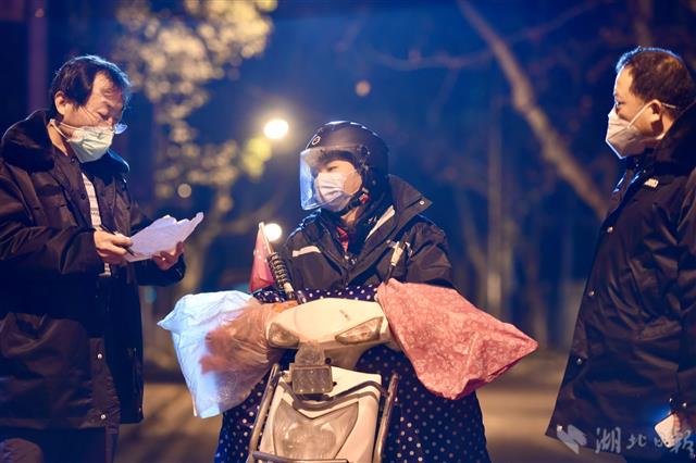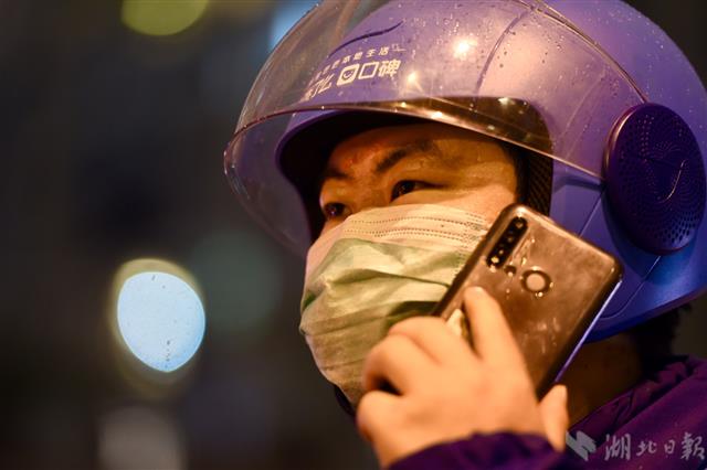 2月28日晚8时,骑手陈宇途径武昌双湖桥前往武汉大学中南医院送外卖食品。