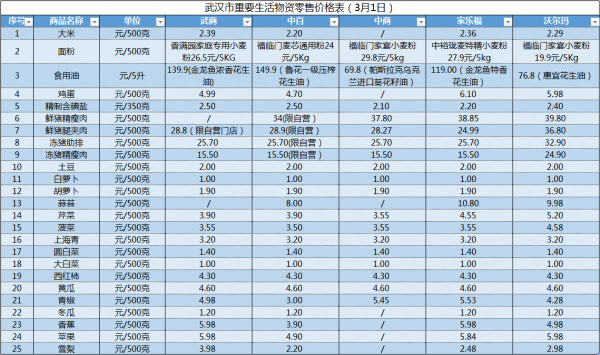 长江网3月1日讯(记者张维纳)武汉市小区实行封闭管理以来,全市各大商超与社区对接,实行团购配送。自2月22日起,武商、中百、中商、家乐福、沃尔玛等五大超市将25种重要生活物资销售价格定期公布,让市民足不出户明明白白消费。