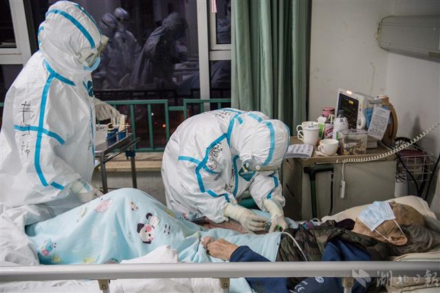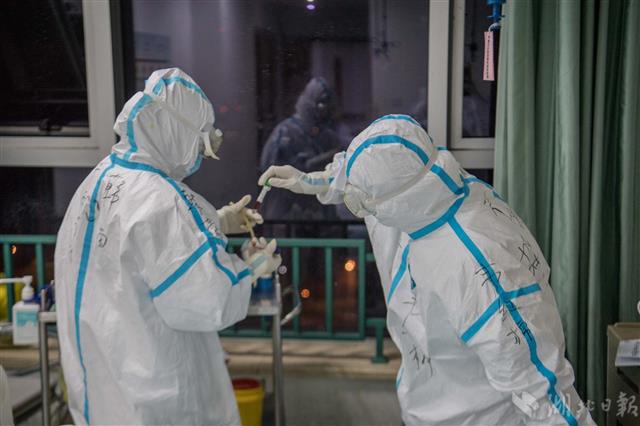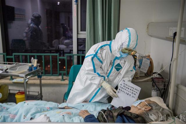3月1日凌晨,武汉市中心医院发热十一病区隔离病房,广西医疗队的护士韩苗、韦红棉给一位老年患者抽血,韩苗还特意手写了卡片方便和患者交流。