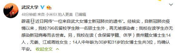 中新网3月2日电 据武汉大学官方微博消息,近日网传“一位来自武大女博士新冠肺炎的遗书”,武汉大学2日凌晨辟谣称,经核实,自新冠肺炎疫情以来,武汉大学796名留校学生除一名硕士生外,再无被感染者;武汉大学在读学生亦无感染新冠病毒而去世者。