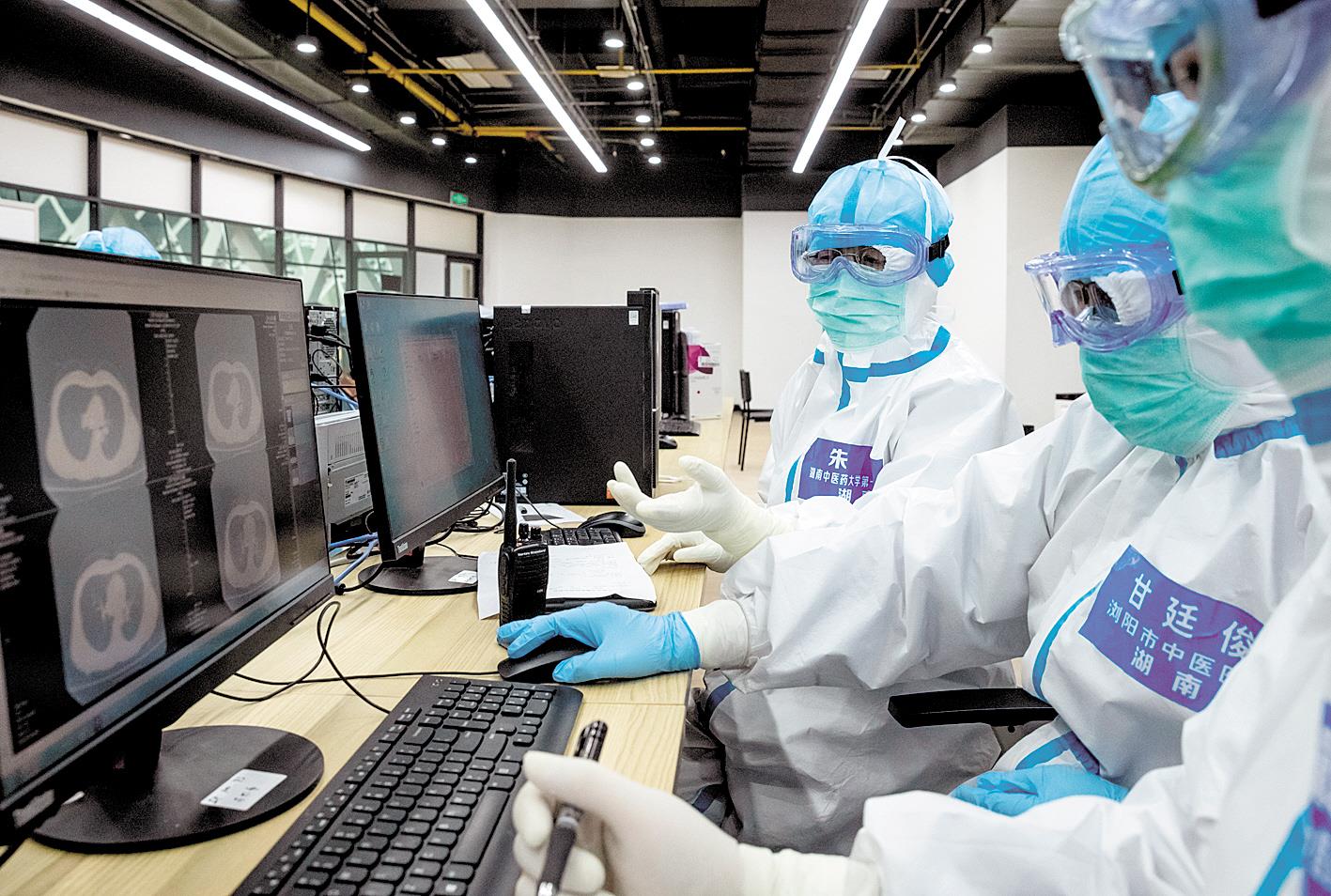 2月25日,湖南省援鄂抗疫国家中医医疗队医护人员,在武汉市江夏区方舱医院为新冠肺炎患者会诊中医治疗方案。 (湖北日报全媒记者 张鸿 通讯员 涂丽 摄)