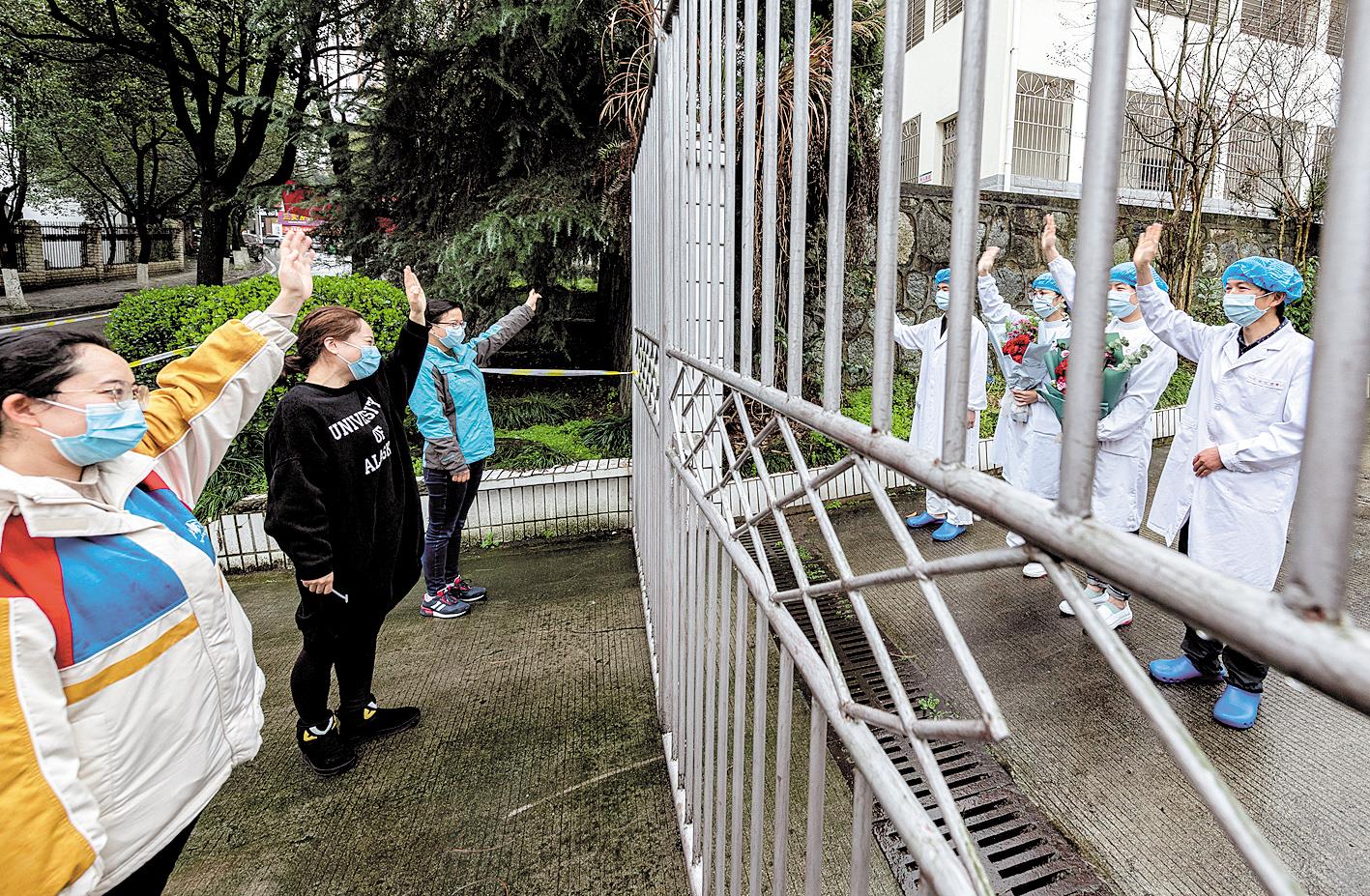 2月27日,秭归县人民医院新冠肺炎隔离治疗点医护人员的家属代表(左)在大门外隔着铁栅栏向医护人员挥手致意,等他们安全回家。当日,该院最后2名确诊患者治愈出院。至此,该治疗点的22名确诊患者全部治愈,治疗点的医护人员还将隔离14天才能与家属团聚。(视界网 郑家裕 摄)