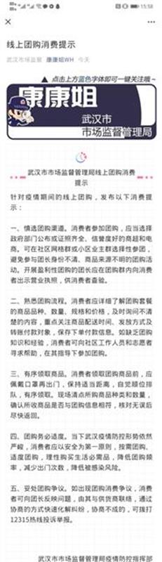 目前,武汉疫情防控形势依然严峻,消费者应以安全为第一原则,按需团购、适度团购,理性购买生活必需品,降低团购频率,减少出门次数,降低被感染风险。