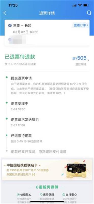 武汉市民张先生反映,2月24日,他购买了3月2日青岛航空三亚飞往长沙的机票,加上机建费、燃油费总共支付了1068元。因疫情影响,他当日申请退票,只收到退款505元。张先生查询退改签规定发现,起飞前7天之前退票手续费收取30%。“我这也是提前7天退的,怎么收了50%?”