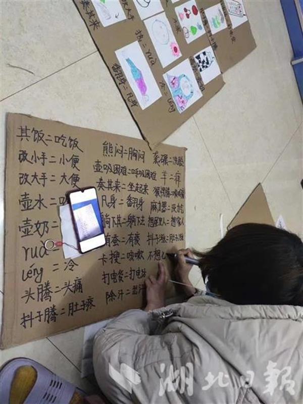 “提出这个想法的初衷,主要是考虑重症监护室那些呼吸道插管病人,他们有的意识清楚,但不能说话,图文并茂的形式能很好地了解他们的需求。”徐琼介绍,因为多数队员听不懂随州话,便在本地医院同事的指导下,归纳了一些工作中经常出现的话语,用随州话和普通话“翻译”出来,方便与患者特别是老年患者交流。