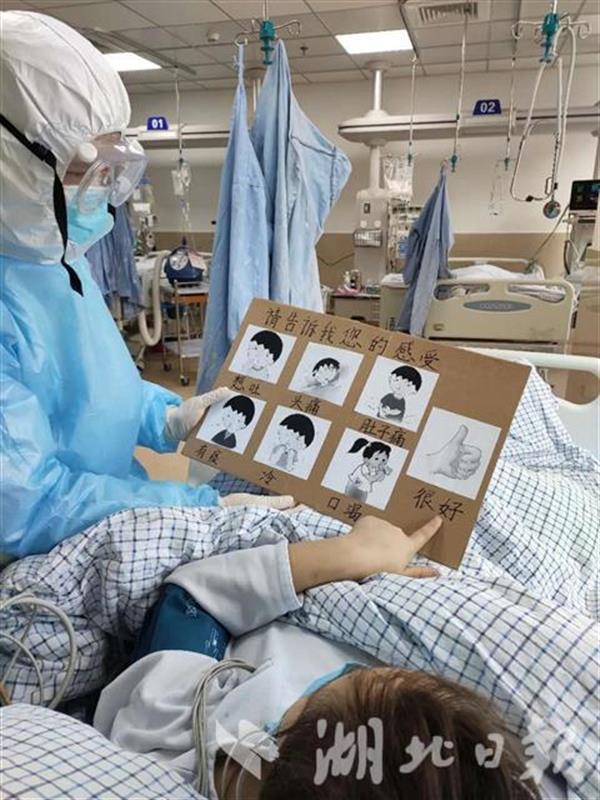 湖北日报讯(记者赵良英、通讯员黄闯、谢玉兰)“想吐、头痛、肚子痛、有痰、冷、口渴、很好……请告诉我您的感受?”3月1日,在随州市中心医院文帝院区重症监护室,江西援随医疗队员徐琼拿着自制的特殊板报,向患者了解病情。