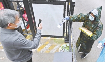 3月2日,东湖高新区关东街道金地华公馆小区社区党员采购队队员(右)按门栋错时将采购物资送到小区取货点
