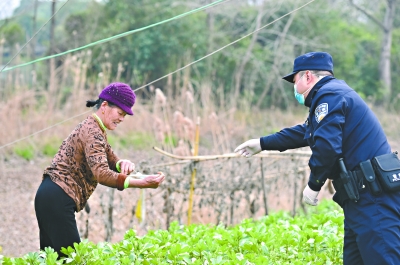谷照华为在田间采摘蔬菜的村民送上口罩