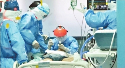 ICU主任周晨亮很快意识到,“患者需要气管插管!”晚一秒就危及生命,周晨亮只能在二级防护服基础上戴一个面屏头盔,开始操作。