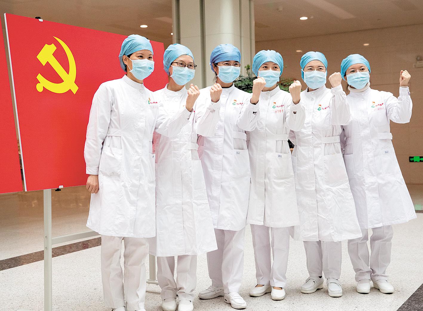 3月2日,同济医院中法新城院区,刚刚完成“火线入党”宣誓的5名抗疫一线女护士和同事在党旗前。她们都是主动报名奋战在抗疫救治最前沿,工作在最危险战线的白衣天使。(湖北日报全媒记者 柯皓 通讯员 童萱 摄)