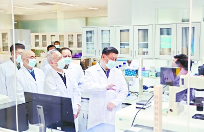 2日下午,习近平首先来到军事医学研究院,听取研究院关于新冠肺炎疫情防控科研攻关的总体情况汇报,结合展板和实物了解疫苗和抗体研制、药物筛选、病毒致病机理研究、快速检测试剂研究和应用等进展情况。在仪器测试楼,习近平察看了重大疫情应急防控药物研究室,向坚守岗位、奋力攻关的一线专家和科研人员表示亲切慰问。他强调,提高治愈率、降低病亡率,最终战胜疫情,关键要靠科技。习近平指出,新冠肺炎疫情发生以来,军事医学研究院坚决贯彻党中央和中央军委决策指示,闻令即动、争分夺秒,集中力量展开应急科研攻关,取得了阶段性成果,充分展现了人民军队忠于党、忠于人民的政治本色和敢打硬仗、善打胜仗的优良作风。习近平希望他们再接再厉,充分发挥突击队和主力军作用,尽快研制出安全有效的疫苗、药物、检测试剂,全力满足抗击疫情需要。要坚持在疫情可溯、可诊、可防、可治、可控方面合力攻关,通过打这场硬仗,掌握更多具有自主知识产权的核心科技,拿出更多硬核产品,为维护人民生命安全和身体健康、维护国家战略安全作出更大贡献。