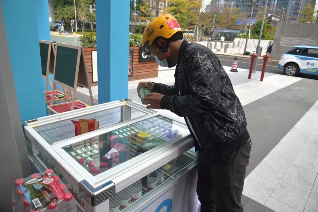 2月29日,一位外卖小哥从“无人冰柜”里领取饮料。新华社记者 赵瑞希 摄
