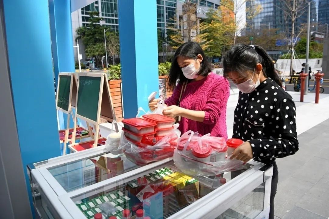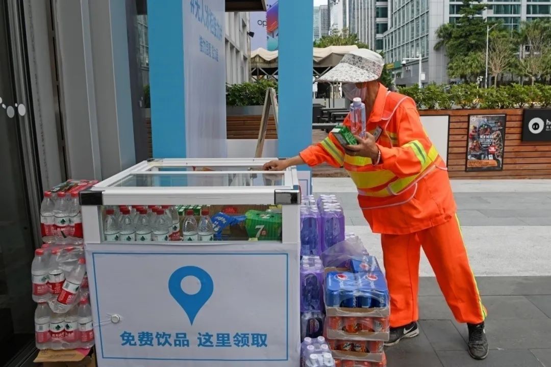 2月29日,一位环卫工人从“无人冰柜”里领取饮料。新华社记者 梁旭 摄