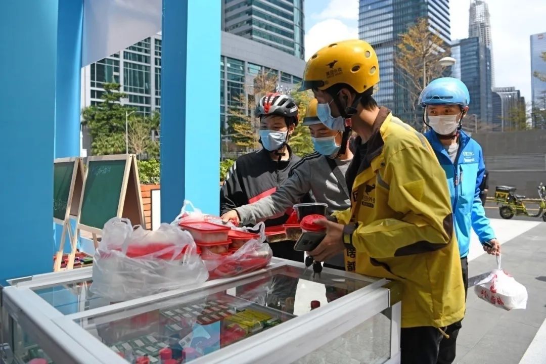 2月29日,外卖小哥在“无人冰柜”前领取午餐。新华社记者 梁旭 摄