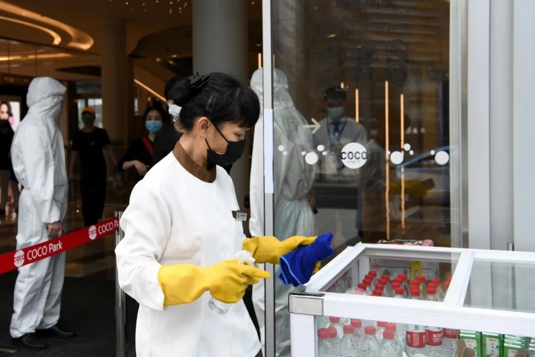 2月29日,商场保洁人员对“无人冰柜”进行清洁和消毒。新华社记者 梁旭 摄