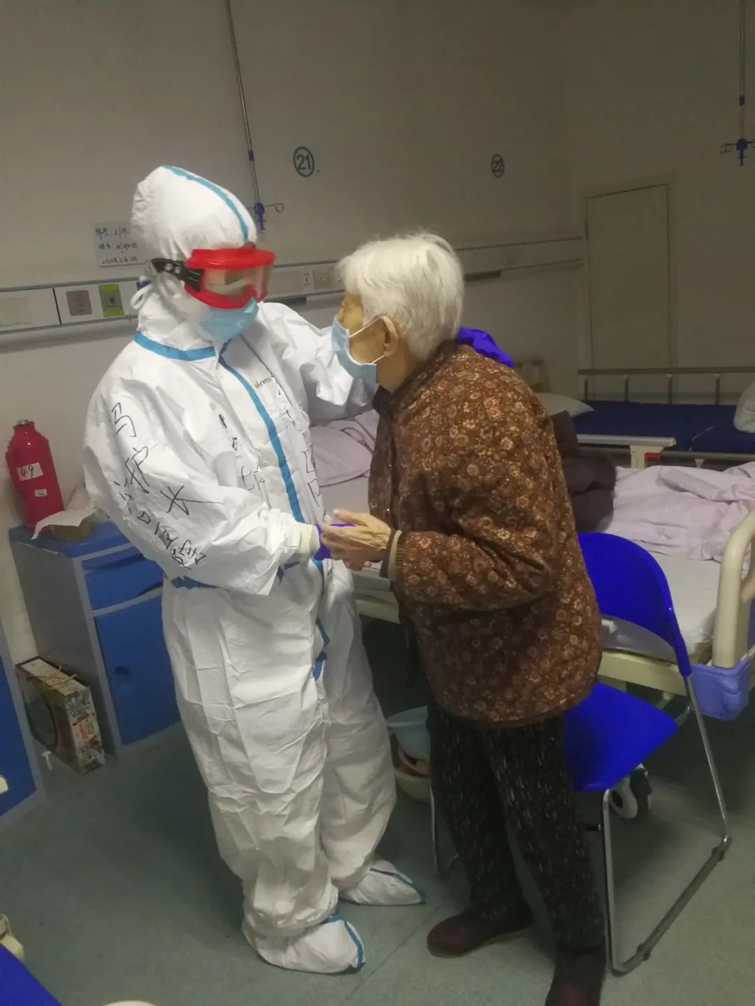 今天,我所在的病区有一位90岁高龄的刘奶奶治愈出院了,她拉着我的手和我道别,对我们医护人员表示感谢,还鼓励病友们要有战胜病毒的信心。