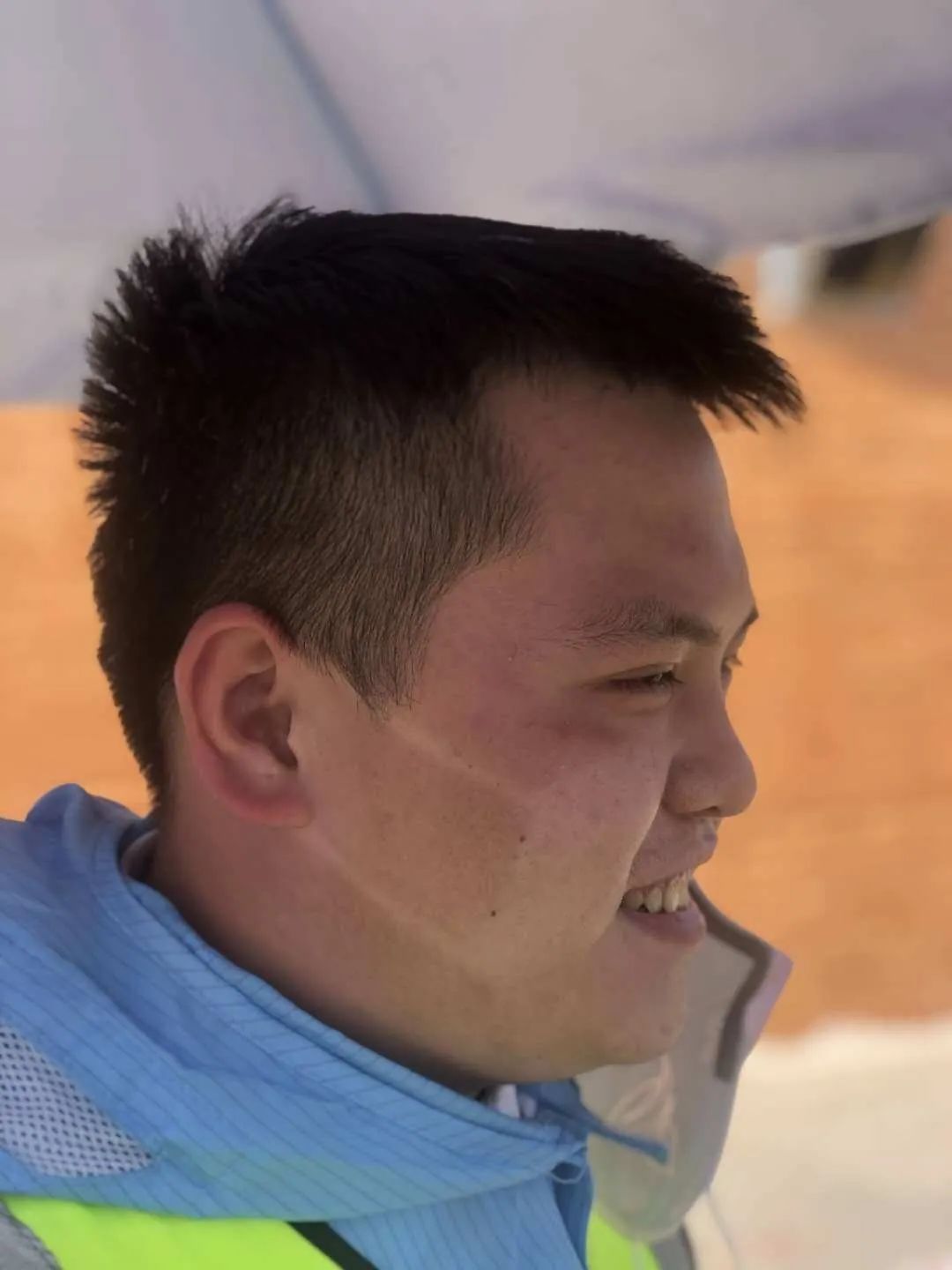 即使是站在遮阳伞底下,戴了遮阳帽,他的脸还是被晒伤了,留下了清晰可见的口罩印。疲惫的他对着镜头,依然露出年轻有活力的微笑。