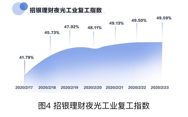 报道援引招商银行近日发布的“夜光工业复工指数”显示,目前中国工业企业复工已经接近五成。指数显示,一周前的2月17日工业复工率为41.79%,2月23日的工业复工率已经上升到49.59%。该指数汇总了全国143个工业园区的卫星夜光数据,可以看到,近期整个工业复工情况明显加速。