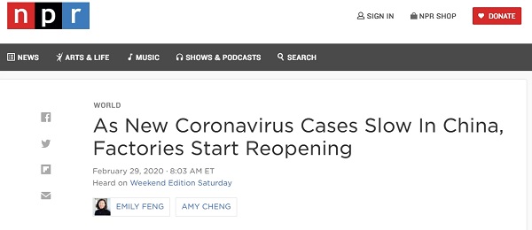 另据美国全国公共广播电台报道,随着中国新冠肺炎新增病例的持续减少,中国多地在统筹好疫情防控的前提下,积极推动复工复产。