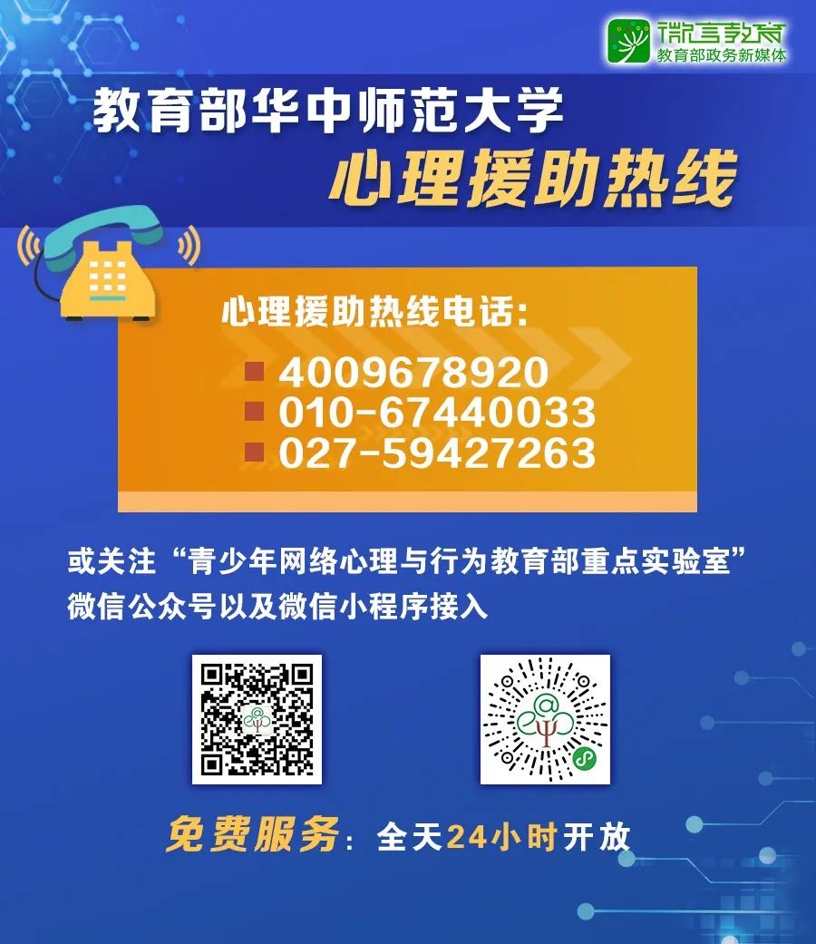 扫描上方二维码,关注“青少年网络心理与行为教育部重点实验室”微信公众号,点击菜单栏中的“心理热线”即可接入。
