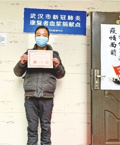 张庆锋捐献400毫升血浆后,领到武汉市第一张荣誉证书