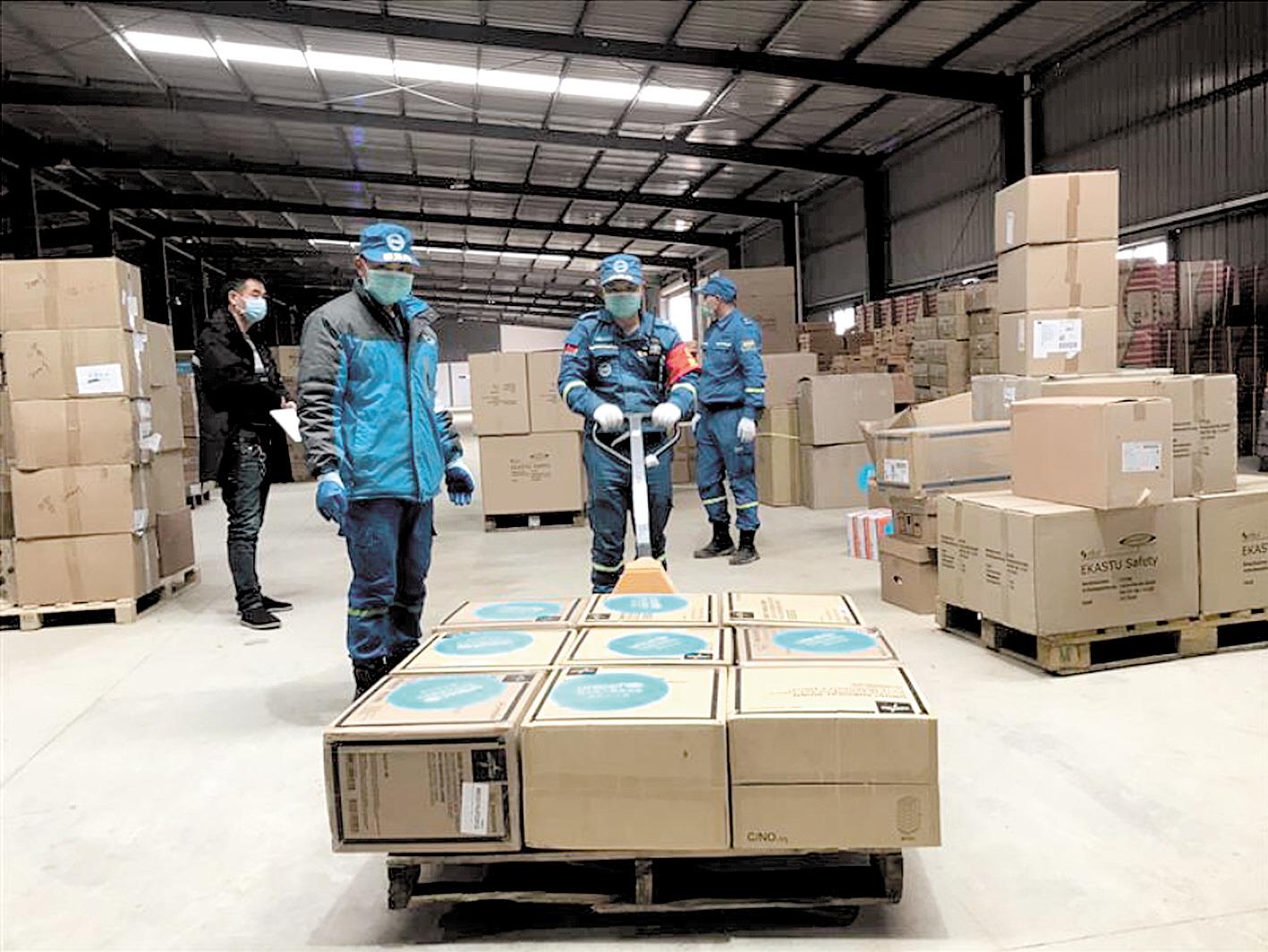 蓝天救援队队员们在仓库内转运物资。
