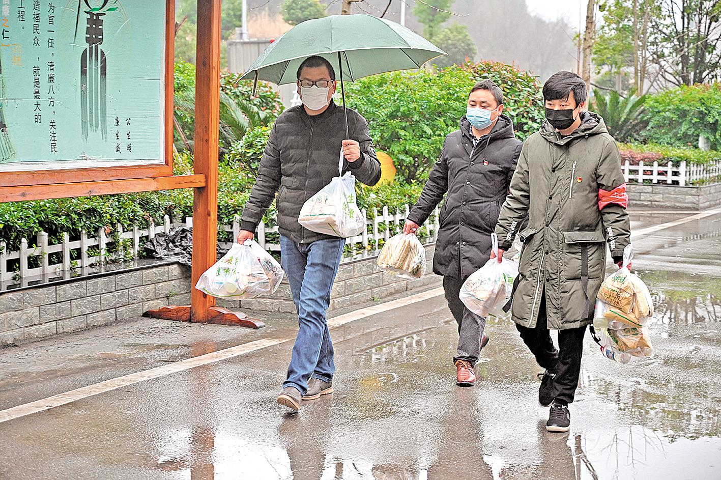 2月27日,宜昌市点军区五龙社区工作人员李学文和志愿者一起,冒着风雨,为辖区康复出院的新冠肺炎患者和密切接触者送去社区配置的中药,提高免疫力。疫情发生以来,点军区对全区慢性病患者急缺药品等情况摸底统计,及时购买药品,风雨无阻送至患者手中。