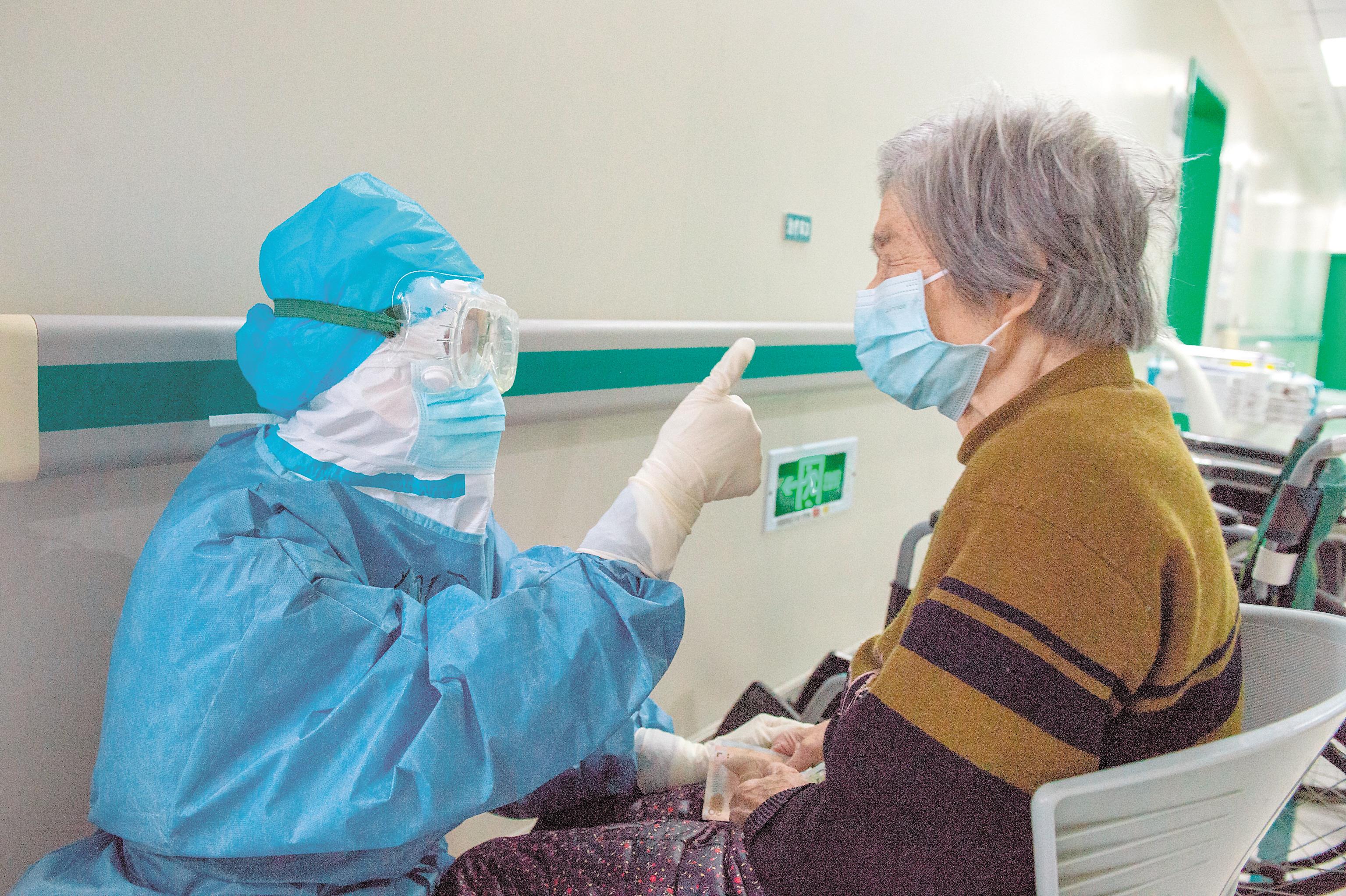3月2日,武汉市第一医院感染科隔离病区,护士周洁(左)鼓励患者增强信心。据了解,武汉市第一医院于2月11日正式成为重症新冠肺炎定点医院。连日来,重庆、江苏等省市的11支医疗队陆续抵达该院进行支援。同时,医院成立了中医联合专家组,倡导使用中西医结合的诊疗方式对患者进行救治。目前,该院共有1000余名新冠肺炎患者正在接受治疗,近200名治愈出院。