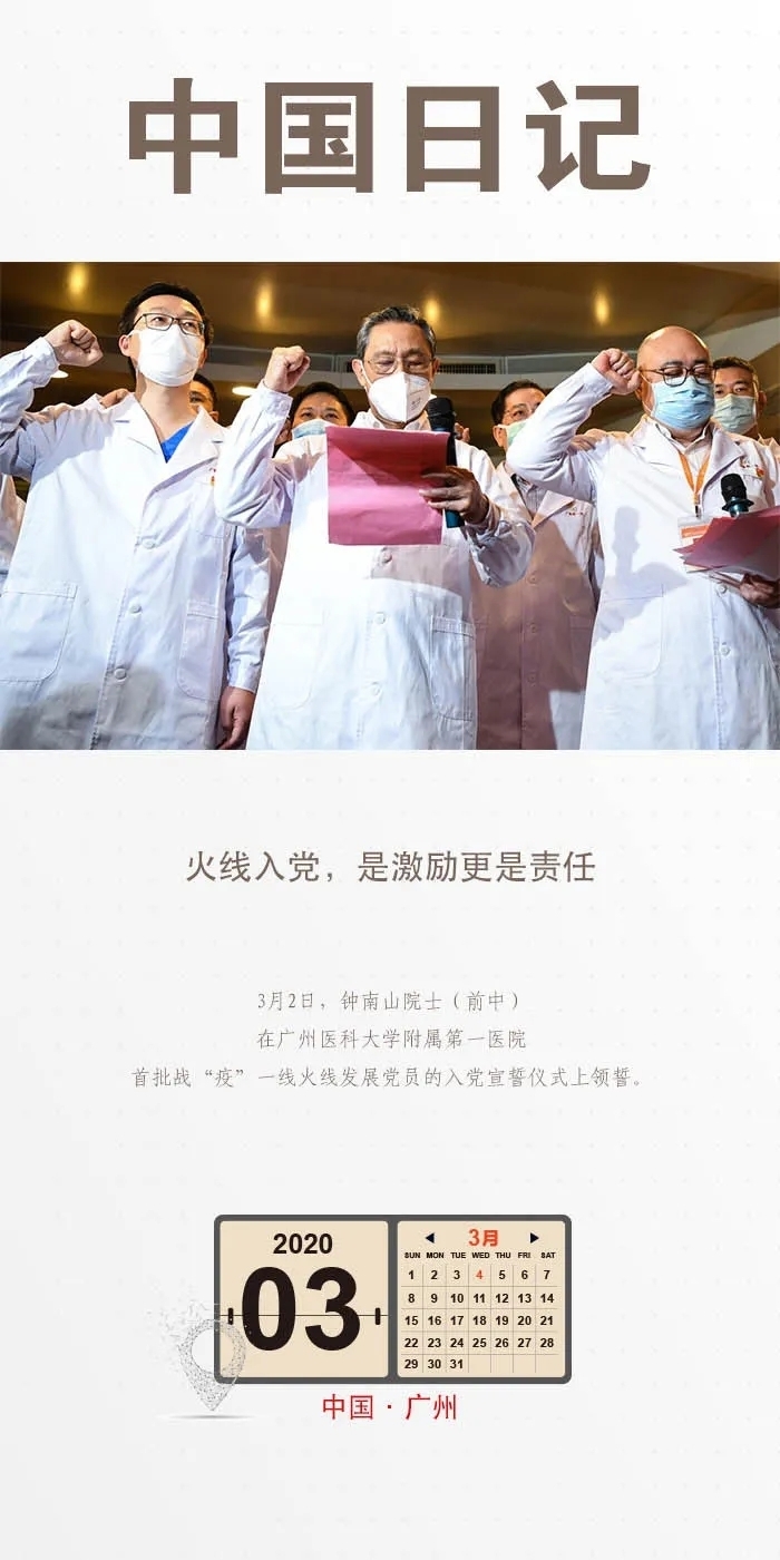 3月2日下午,一场特殊的入党宣誓仪式在广州和武汉两地举行。广州医科大学附属第一医院与广东省驰援武汉医疗队通过远程视频连线,举行首批战“疫”一线火线发展党员入党宣誓仪式,钟南山院士领誓。