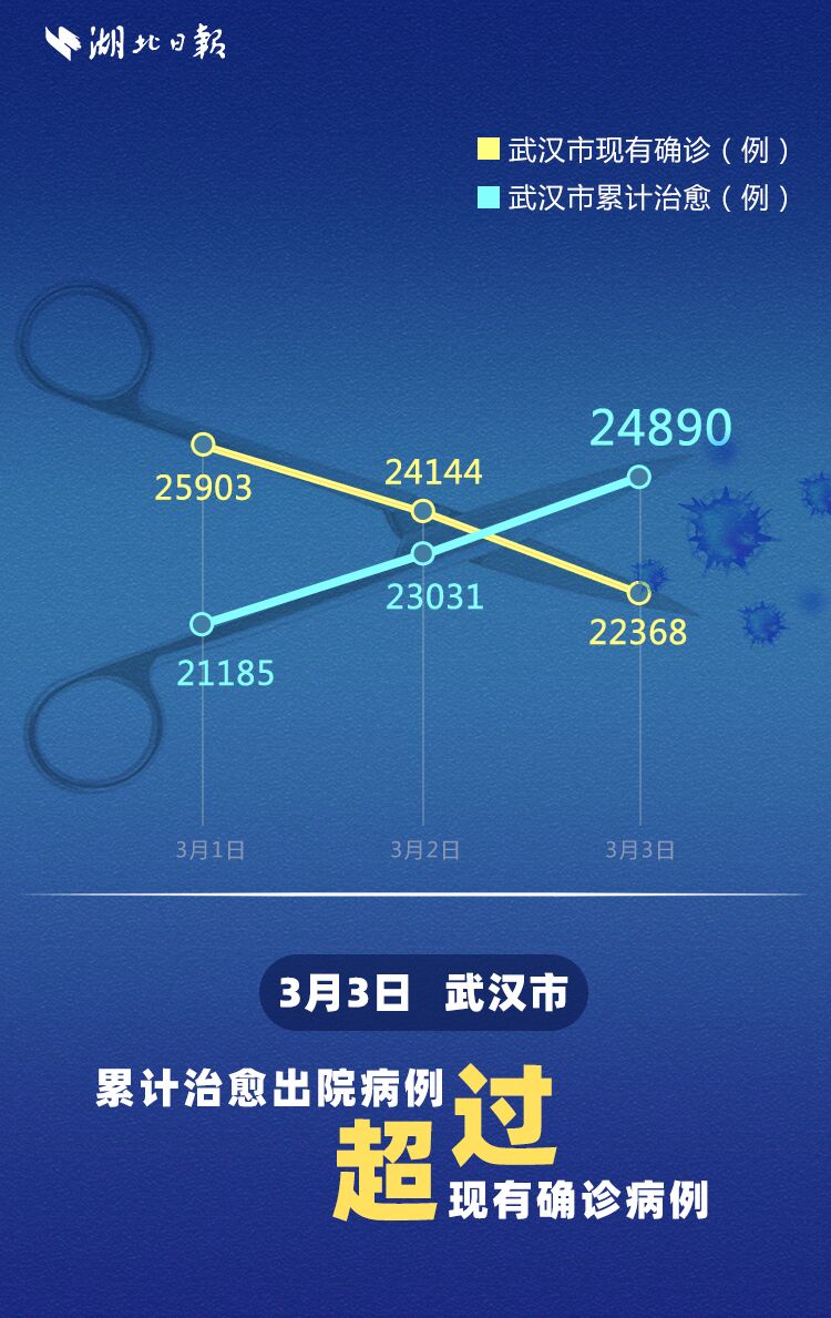 3月3日,武汉市现有确诊病例22368例,累计治愈出院病例24890例。武汉市累计治愈出院病例,首次超过现有确诊病例。