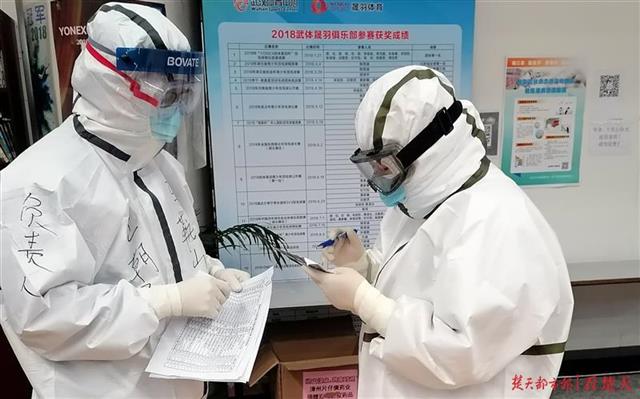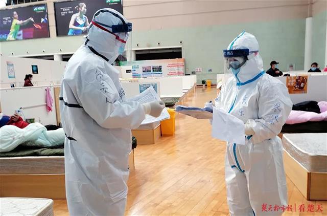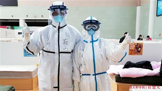 武汉体育中心方舱医院训练馆病区医生周国红(右),因在防护服上写字叮嘱女儿好好写作业而成为“网红”