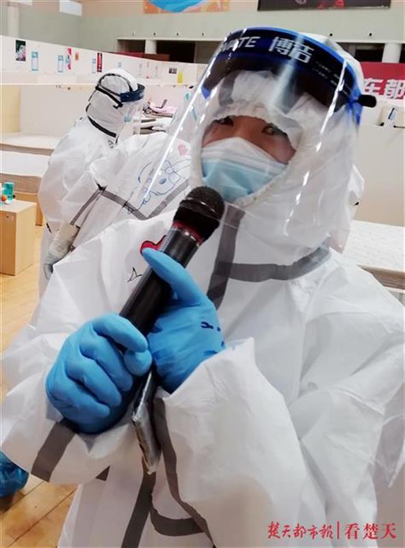 3月4日上午,在武汉体育中心方舱医院安徽援汉医疗队办公区,一名护士高兴地唱起了《不说再见》,欢送又一批20名患者治愈出舱。