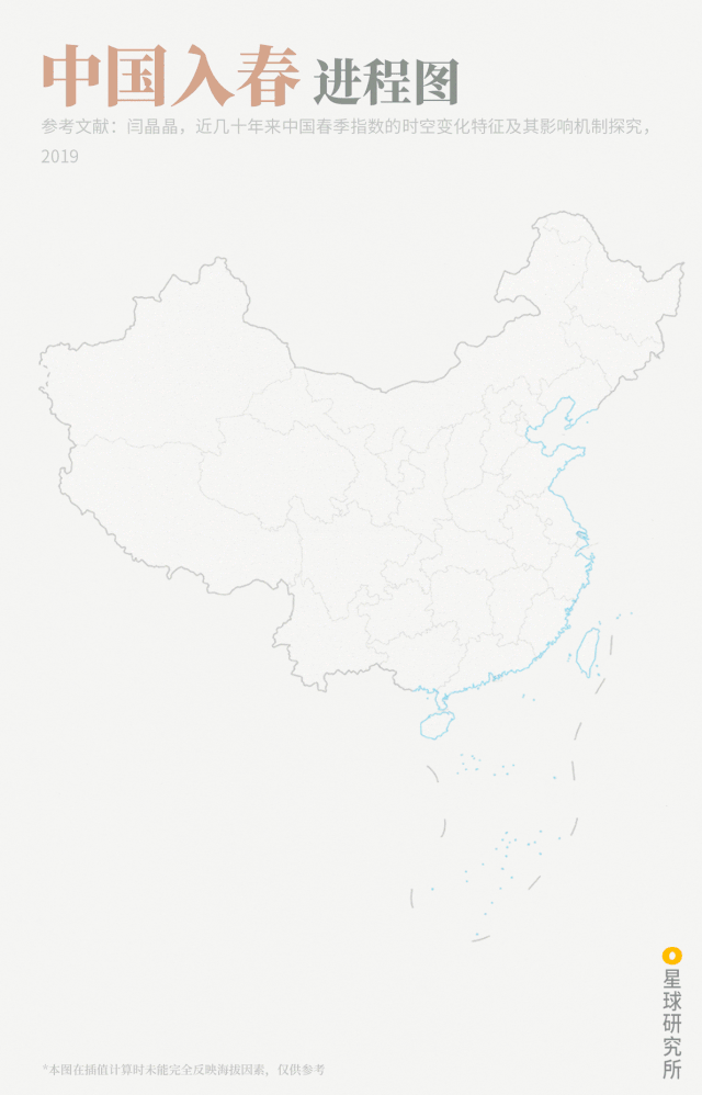 将向中国陆地的各个区域依次发起“攻击”占领它、娇艳它、美颜它(中国入春进程图,为1951-2014年均值,制图@巩向杰&赵榜/星球研究所)▼