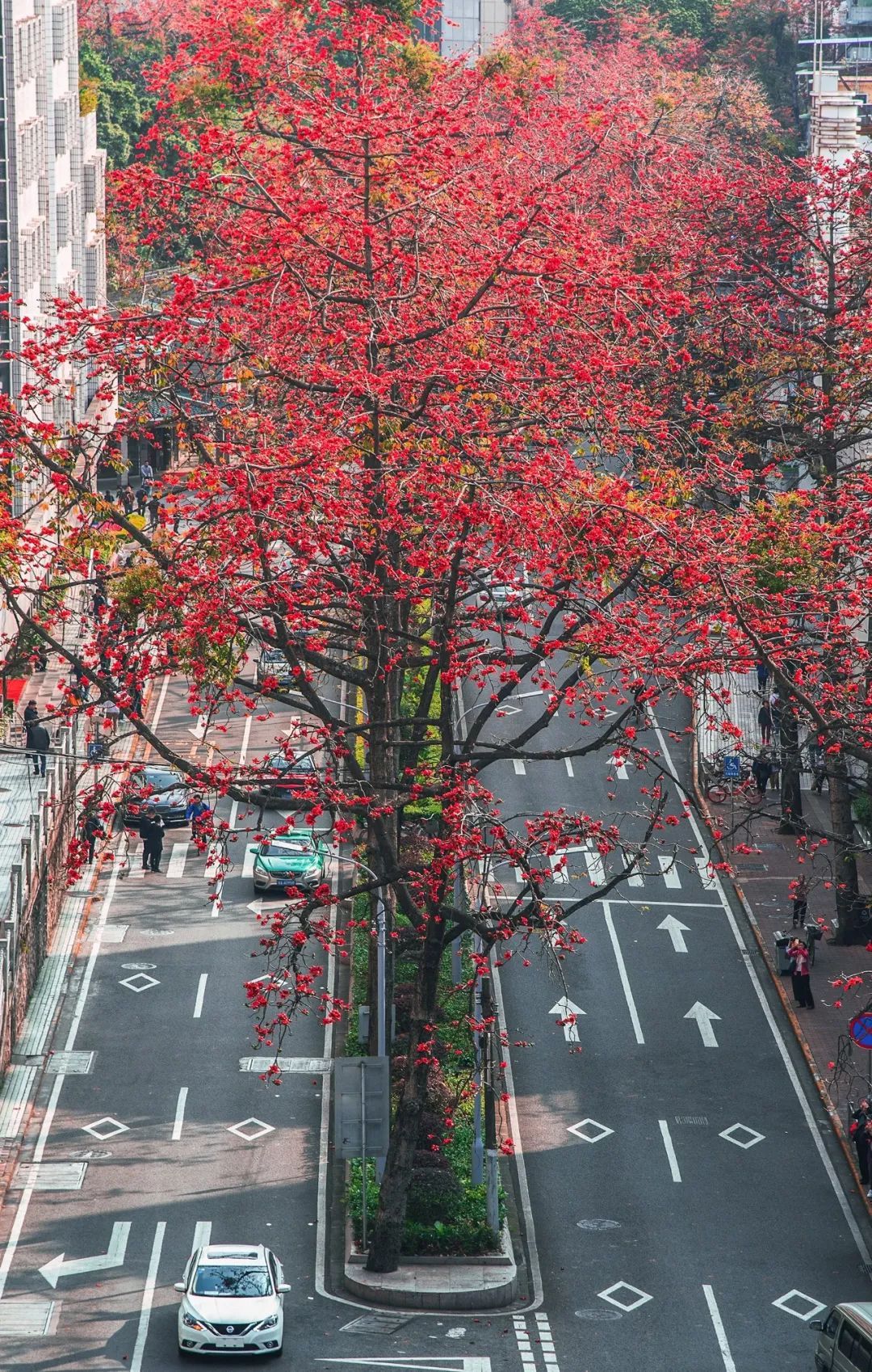 入春以后蒲桃、泡桐、麻栎木棉、桃树、朴树柚、荔枝、垂柳、楝树相继绽放花朵将广州装点为“花城”(广州的街道,洋紫荆,摄影师@静言)▼