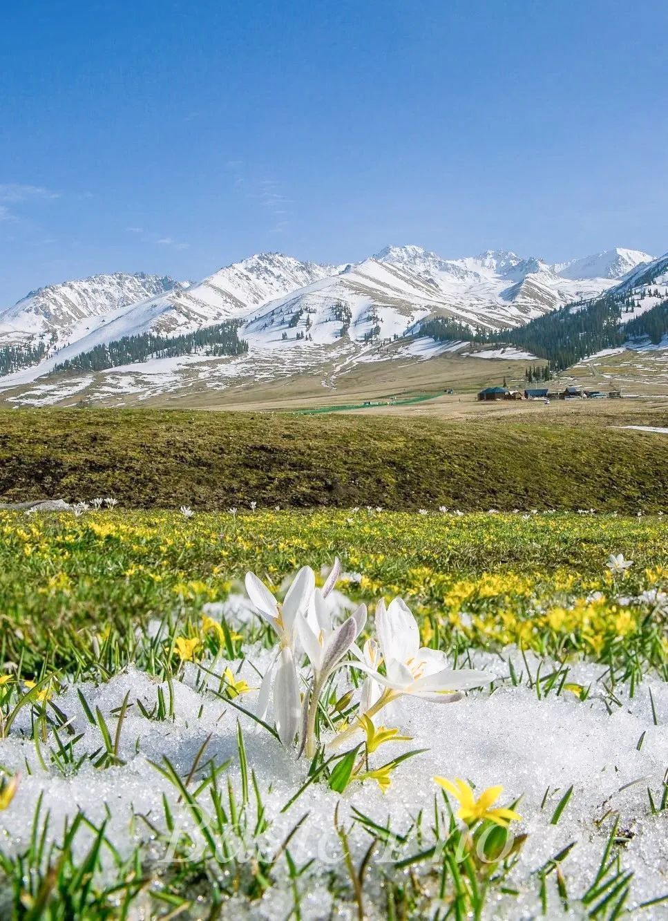 就已经在急吼吼地生长(新疆那拉提草原,白色为白番红花,黄色为一种顶冰花,摄影师@李茂基;伊犁谷地的植物资料主要依据毛祖美等《新疆北部早春短命植物区系纲要》)